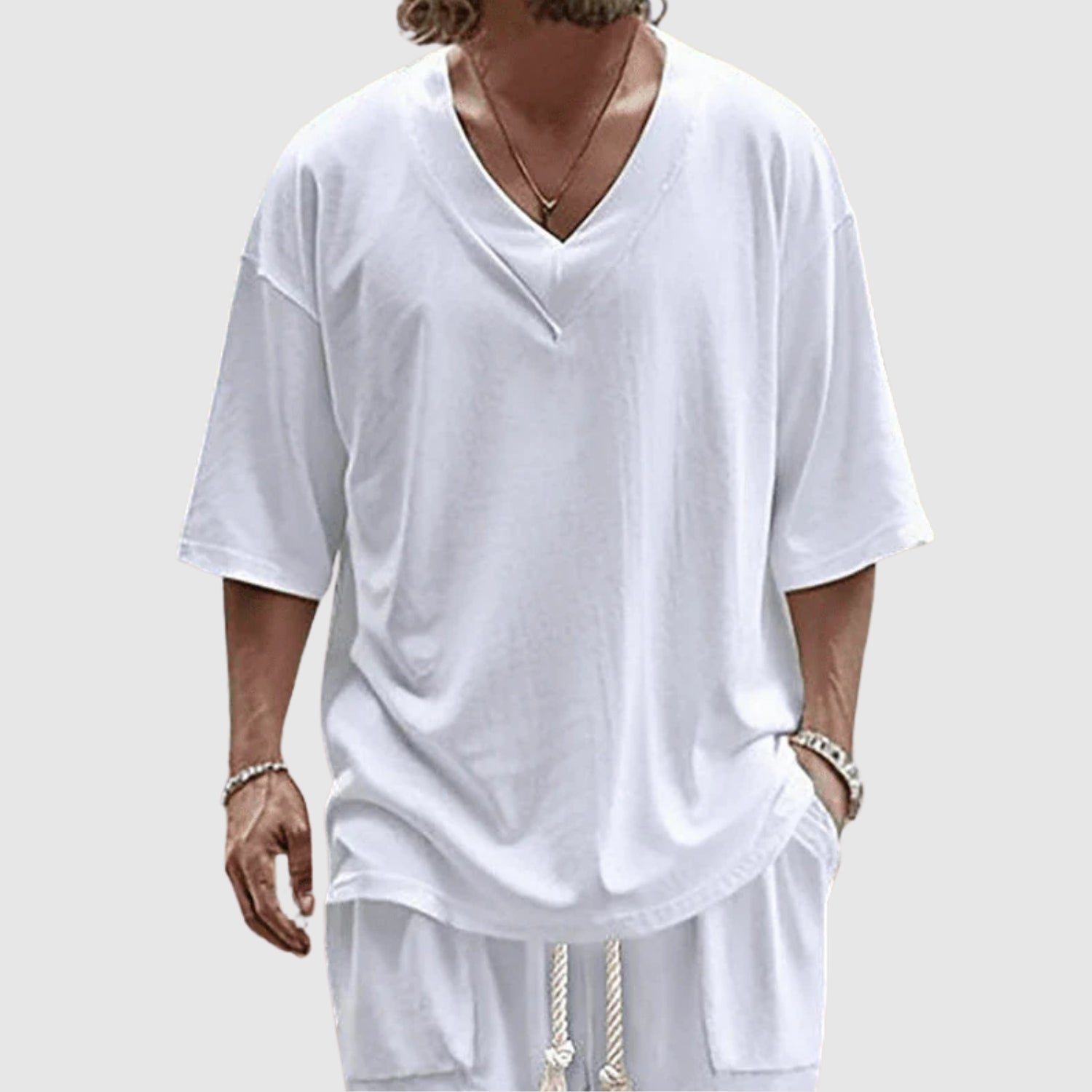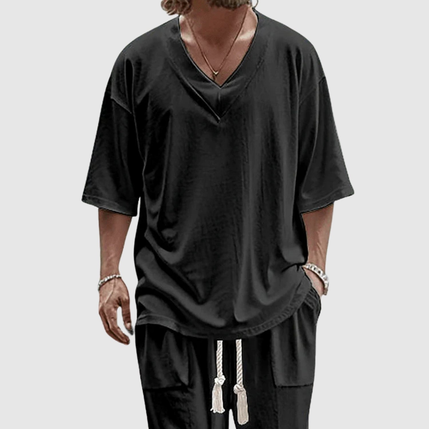 Αυτό το ανδρικό σετ προσφέρει μια νέα διάσταση στην άνεση και τον ατημέλητο στυλ. Χάρη στον ομαλό και μοντέρνο σχεδιασμό, αυτό το σετ είναι ιδανικό για ήρεμες μέρες, ταξίδια ή απλά για χαλάρωση, χωρίς να χάσετε το προσωπικό σας στυλ. Η ελεύθερη γραμμή του φέρνει φρεσκάδα και ελευθερία και τονίζει τον μοντέρνο και ανέμελο τρόπο ζωής σας.