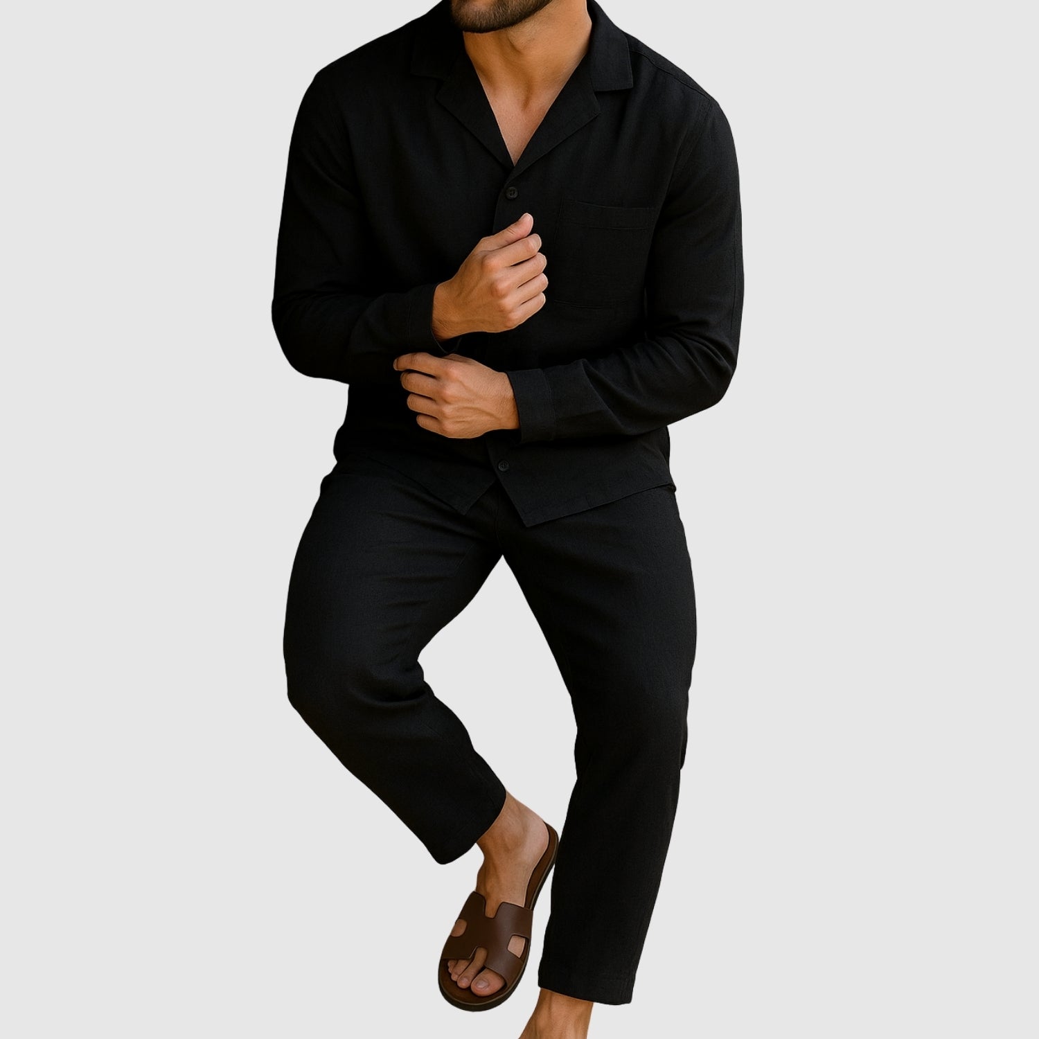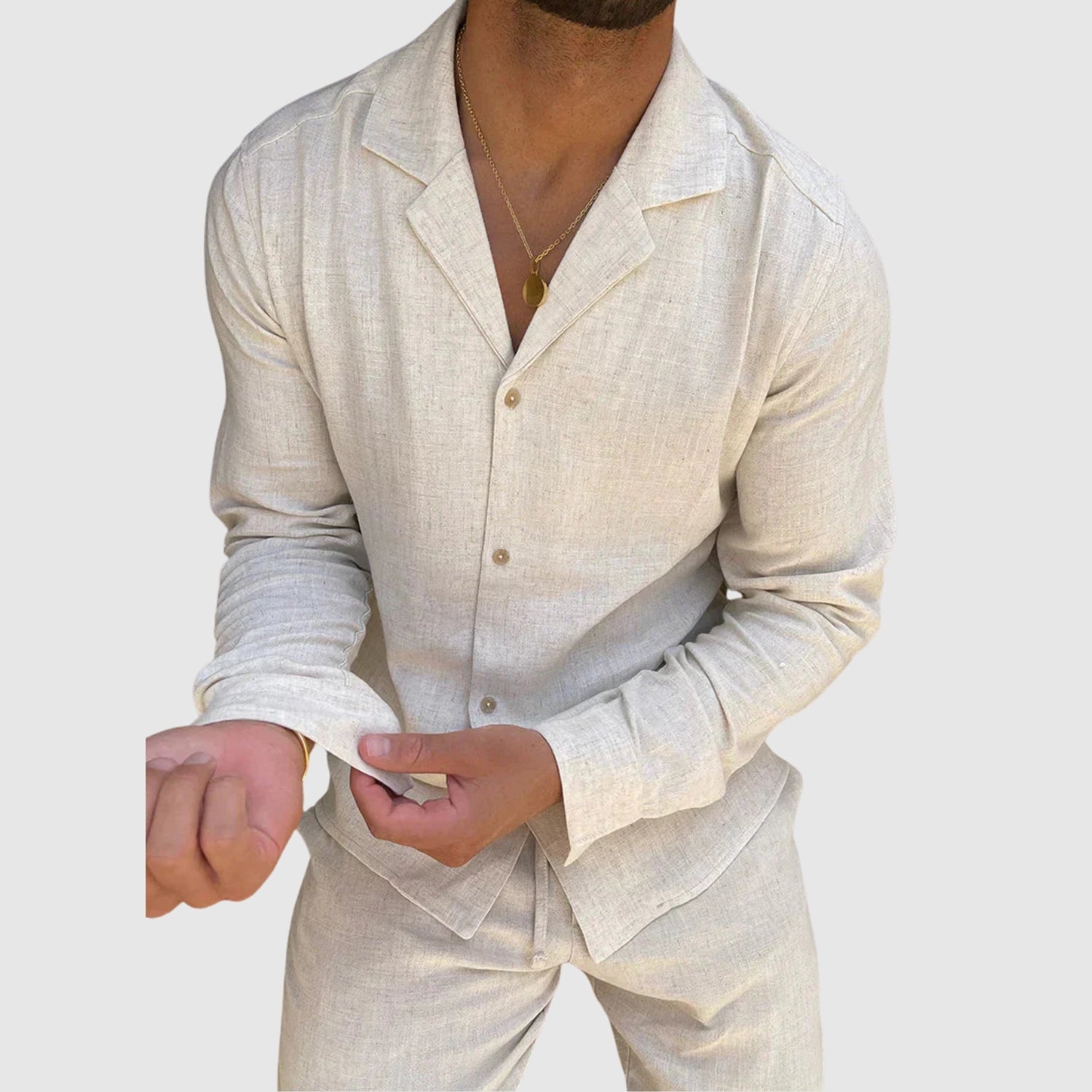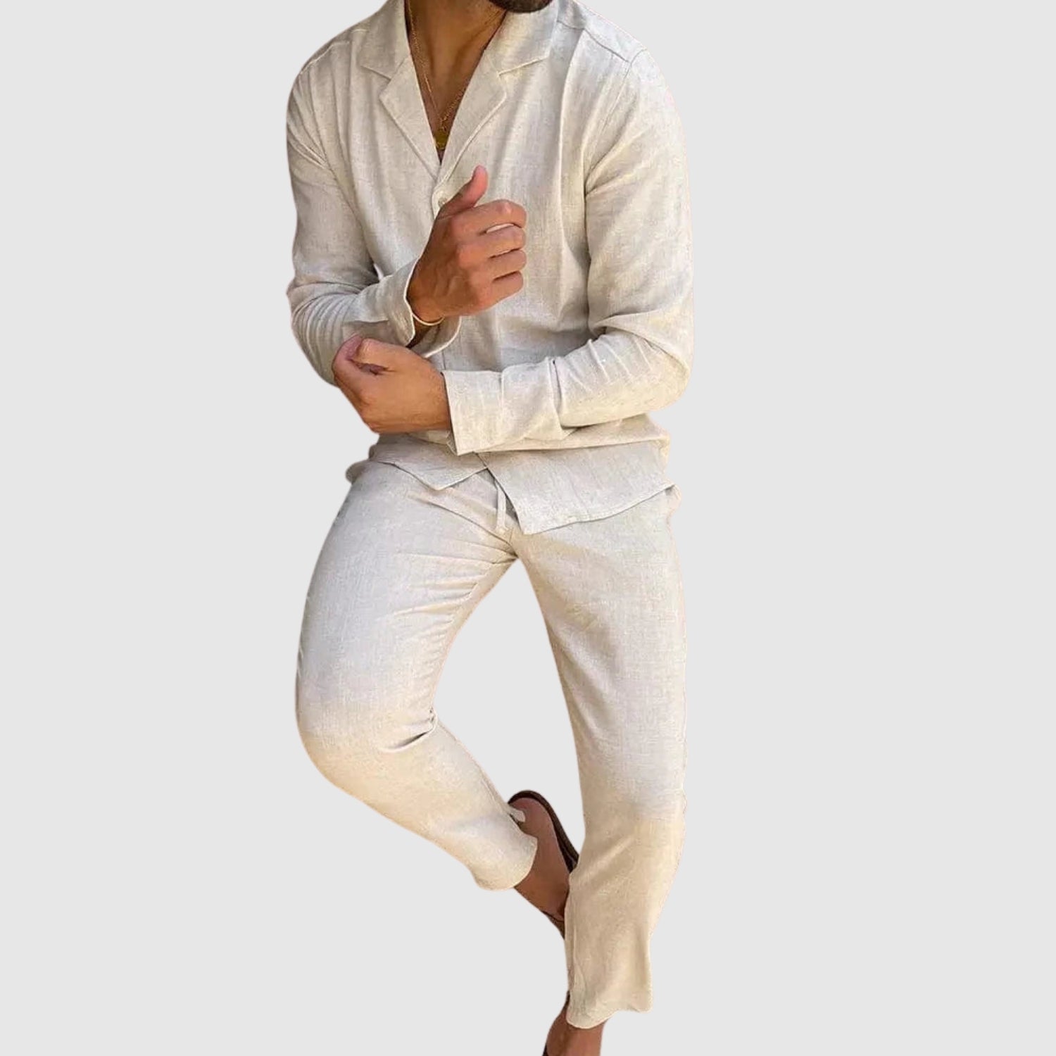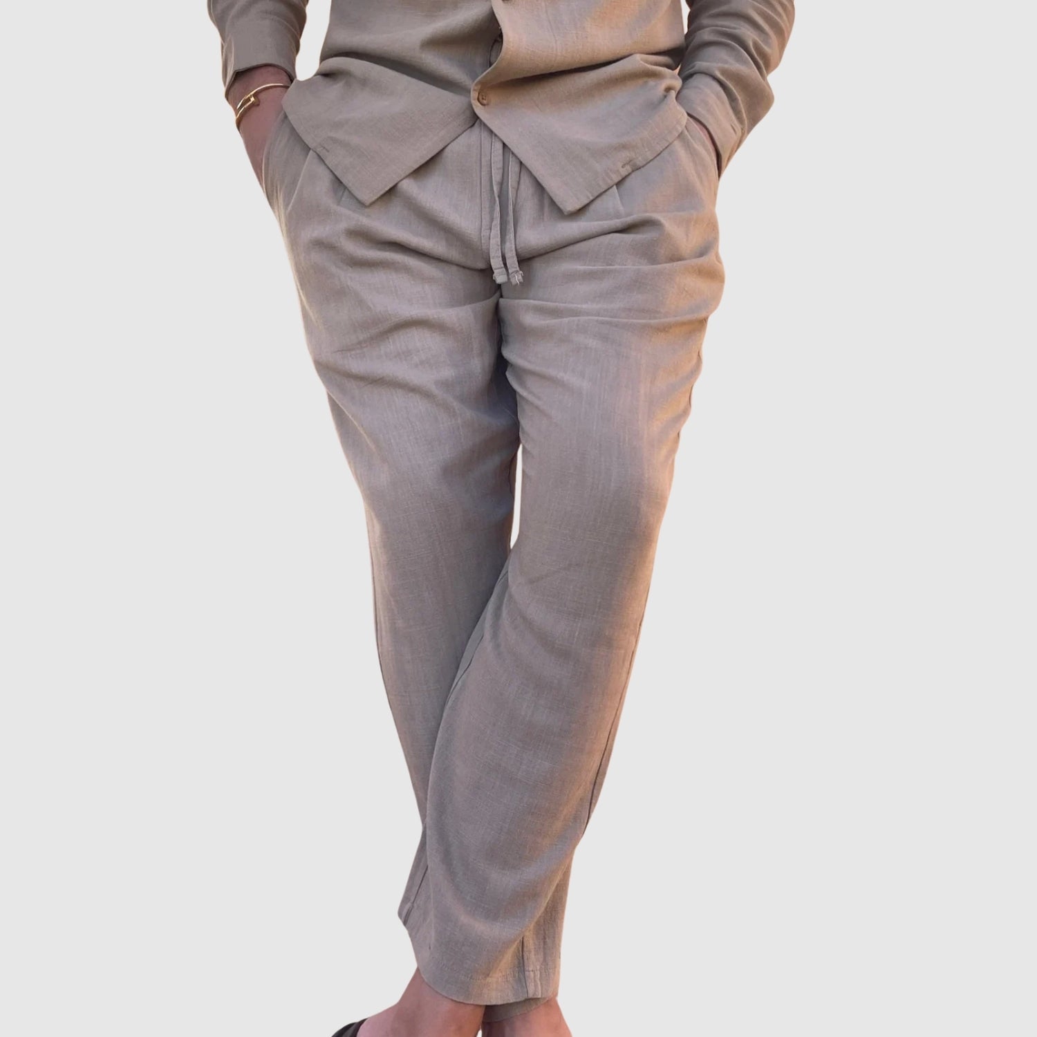 Αυτό το λινό σετ προσφέρει την τέλεια συνδυασμένη άνεση και στυλ. Το ελαφρύ και αναπνεύσιμο ύφασμά του θα σας κρατήσει άνετους καθ' όλη τη διάρκεια της ημέρας, ενώ ο εκλεπτυσμένος σχεδιασμός του θα σας επιτρέψει να φαίνεστε αψεγάδιαστοι σε κάθε περίσταση, από ανεπίσημες συναντήσεις μέχρι ειδικές εκδηλώσεις.