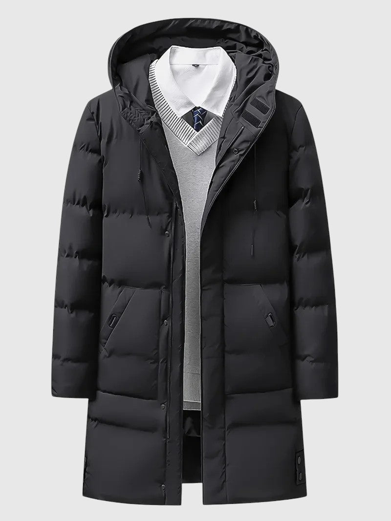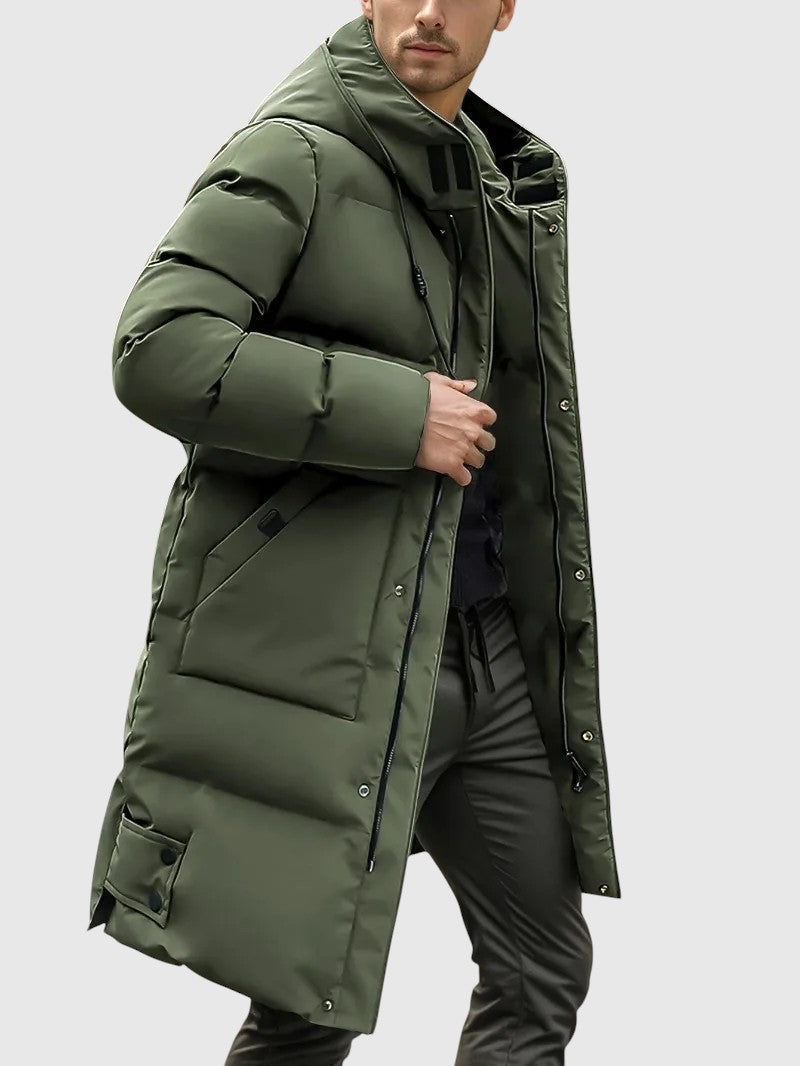 Το μακρύ παλτό με μοντέρνο σχέδιο έχει σχεδιαστεί για να προσφέρει μέγιστη προστασία και άνεση τις κρύες μέρες. Η πουπουλένια επένδυση παρέχει αποτελεσματική μόνωση, ενώ η κουκούλα και ο ψηλός γιακάς ενισχύουν την προστασία από τον άνεμο και τις χαμηλές θερμοκρασίες. Οι λειτουργικοί θήκες και το κλείσιμο με κουμπιά προσθέτουν πρακτικότητα στο κομψό σχέδιο, κάνοντάς το αυτό το άρθρο καθολικό για την αστική ζωή και την ελεύθερη ώρα.